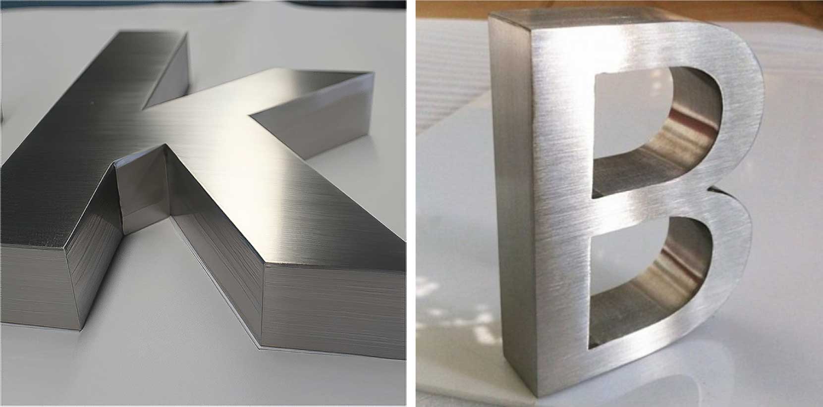 - Chữ cắt phẳng (2D): Sử dụng tấm Alu xước dày 2mm – 3mm, cắt CNC theo hình dạng chữ rồi dán trực tiếp lên nền bảng hiệu (thường là nền tối màu như đen hoặc xanh đen để nổi bật màu bạc).